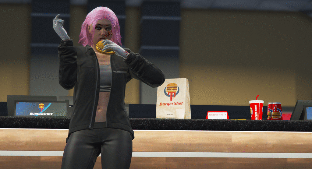 The city’s delicacies vary! From overly fatty foods to healthy hospital food sold right to you at Pillbox! Whenever you feel hungry, pick up a snack at a restaurant, bar, convenience store, or even at a hospital! You’ll notice an increase in stamina. Food is vital to keeping your character full which comes with its plethora of benefits the main being stamina as mentioned prior.
